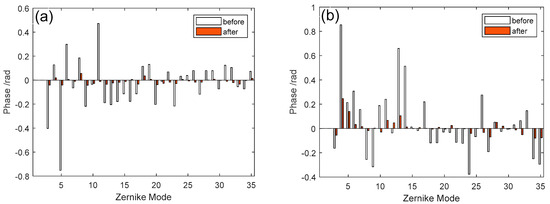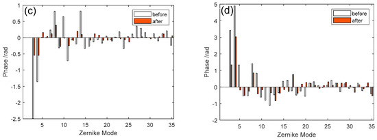 The Zernike coefficients of the wavefront aberrations corresponding to Figure 8 before and after correction are shown in Figure 9, where (a) is for D/r0 = 5, (b) is for D/r0 = 10, (c) is for D/r0 = 15, and (d) is for D/r0 = 20. Since low-order Zernike modes account for a large amount, we present Zernike coefficients ranging from 3 to 35 order.
