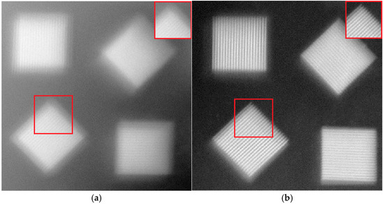 The imaging comparison before and after correction is shown in Figure 12. It can be seen from Figure 12 that the fringes before correction are very fuzzy, while the fringes after correction are clearly visible, and the imaging sharpness is greatly improved. There are 20 clear lines on the corrected resolution board and the width to distinguish a pair of adjacent light and dark stripes is 50 μm, which is very close to the diffraction limit. The red frame in the image is locally enlarged for comparison.