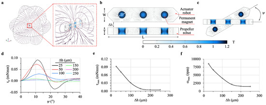 Schematic of the active mixing system with design parameters. (a) The magnetic field distribution generated around two identical microrobots within the mixing system. The inset shows a close-up view of the concentrated field lines between the actuator and propeller robots, illustrating the magnetic interactions that facilitate mixing. (b) Close frontal view of the robots with magnetic field force lines. (c) The angular difference, , between the actuator and propeller robots during rotation, varies with fluid and actuator speeds. (d) Torque, , on the propeller robot as a function of . (e) Relationship between maximum torque and levitation height, , showing an exponential decrease in torque with increasing . (f) Maximum propeller speeds, , indicating a range of 1501.4–8602.4 rpm.
