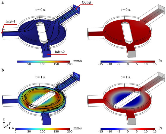 Flow velocity and pressure distribution in the mixing chamber at different times. (a) Initial state (t = 0 s) showing velocity magnitude and pressure distribution as fluid enters through Inlet-1 and Inlet-2. The velocity plot (left) indicates initial flow patterns with high speeds near the inlets, while the pressure plot (right) displays a symmetric pressure distribution. (b) After 1 s (t = 1 s), flow velocity (left) and pressure distribution (right) reflect the development of rotational flow within the chamber, driven by the propeller robot. Velocity gradients in the mixing area indicate effective fluid mixing, and pressure differentials illustrate the dynamic impact of rotation.