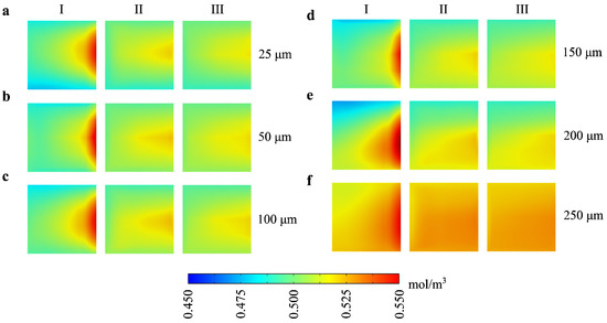 Mixing Index (MI) distributions at different levitation heights of the propeller robot, showing concentration profiles across three sections (I, II, III) at the outlet. Each row (a–f) corresponds to a specific levitation height (25, 50, 100, 150, 200, and 250 µm, respectively) and demonstrates the concentration distribution from the inlet toward the outlet. The color bar (0.45–0.55 mol/m3) represents the concentration levels, where red indicates higher mixing efficiency and blue represents lower mixing efficiency. As levitation height increases, the mixing efficiency generally decreases, as indicated by lower concentration gradients across sections I, II, and III.