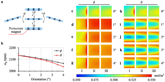 Figure 5 shows a propeller robot parallel to the surface at its center, with the three permanent magnets inside depicted in a semi-transparent robot body. The robot’s orientation changes along its short edge (longitudinal) and its long edge (lateral) were represented by the roll angle () and the pitch angle (), respectively. The speed changes, as shown in Figure 5b, were calculated in the propeller robot resulting from these orientations, with black and diamond markers for and red square markers for . Additional pitch movement alters the surface area actively interacting with the fluid, resulting in a greater reduction in speed. Visual representations of the concentrations at 3 s for orientations (Figure 5c–g) and (Figure 5h–l) are shown for angles –, using a common color bar range of 0.450–0.550 mol/m3.
