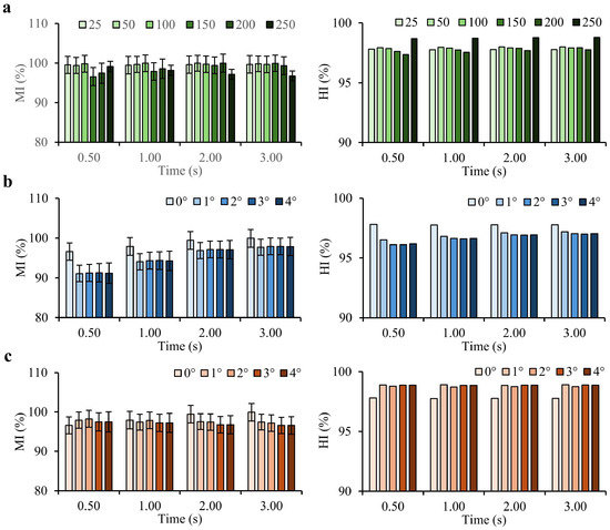 Figure 6b shows the effect of propeller orientations with pitch angle () from 0° to 4° at 1° intervals (Supplementary Table S2). The 0° orientation shows the best results for . Rotational speed decreases with increasing pitch angle, with the most significant speed reduction observed for larger angles. This reduction in speed impacts MI negatively, as shown by the lower MI and HI values for higher angles. These results suggest that minimizing the pitch angle is beneficial to achieve a higher MI. The larger pitch angles cause greater drag forces, reducing the rotational speed and consequently the MI.