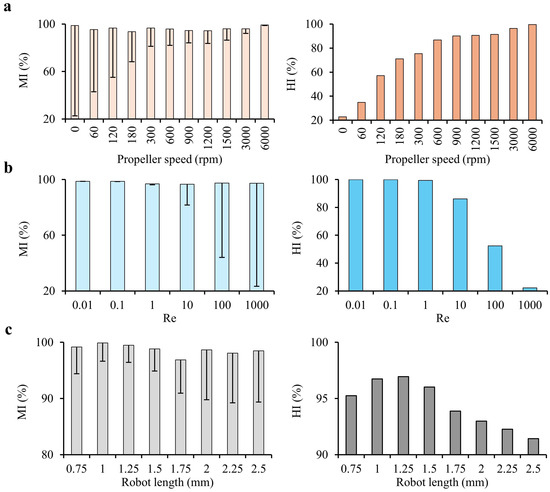 Mixing Index (MI) and Homogeneity Index (HI) for various conditions. (a) MI and HI as functions of propeller speed, ranging from 0 to 6000 rpm. A faster rpm reduces the standard deviation (SD%) in MI% and increases HI%, indicating improved MI with higher rotational speeds. (b) MI and HI as functions of Reynolds number (Re), ranging from 0.01 to 1000. Higher Re increases SD% as the liquids move too quickly through the channel length, not allowing enough time for effective mixing, resulting in reduced HI%. (c) MI and HI as functions of robot length, ranging from 0.75 mm to 2.5 mm. A length of 1.25 mm gives the best result, showing the highest MI, but it has limited space for three magnets in the chamber with a diameter of 3 mm.