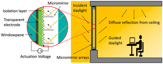 Schematic illustration of MEMS smart window concept where electrostatically actuatable micromirror arrays are arranged in between windowpanes in inert gas environment, allowing active daylight steering inside the building without glare effect. Modified figure from [28].