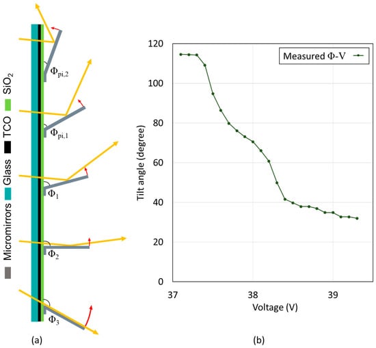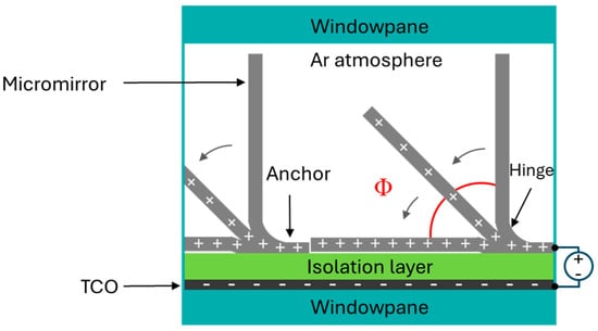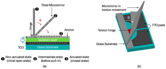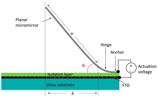 Individual micromirrors consist of a fixed anchor, a properly bent hinge due to tailored stress in metal thin layers and a planar mirror plane via localized stress compensation. The mirror is normally in an open state (90° with respect to the substrate) with no voltage applied (Figure 2). When a potential difference is applied between the mirror (top electrode) and transparent bottom electrode (FTO), both insulated from each other, the micromirrors start to move towards the substrate due to electrostatic attraction forces. Micromirrors can be held in several intermediate tilt angles (Φ) by balancing the electrostatic attraction (due to applied voltage) and the elastic restoring force (bending of hinges) before reaching the critical pull-in point, after which the micromirrors close abruptly on the substrate—a well-known phenomenon in MEMS [29,30,31,32]. The initial tilt angle Φ at 0 V is defined by the residual stress at the hinge, and the tilt angle range ΔΦ is limited by the pull-in effect.