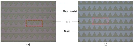 The technological fabrication process of micromirror arrays begins with the FTO structuring process using wet chemical etching based on the FTO etching method invented by McLean et al. [39]. The wet chemical etching process uses zinc (Zn) particles and hydrochloric acid (HCl) for metal–acid etching and FeCl3 as an oxidation and penetration control agent, which prevents under-etching. Photoresist structuring is executed in a photolithography process, which acts as etch mask. Zinc particle size has a significant influence on the efficiency of the ETO etching process. The substrate with a photoresist etch mask is submerged into the etching solution containing HCl (1.27 M) and FeCl3 (0.02 M) for approximately 60 s. Tin oxide (SnO2) is reduced to Sn (tin) by redox reaction, whereas excessive removal of FTO is prevented by the formation of an iron layer from the reaction between Zn and penetration control agent (Fe2+), which is produced via the reaction of Sn with the metal dissolution agent (Fe3+) from FeCl3. Deionized (DI) water is used to stop the wet chemical etching process, followed by immersion into the cleaning solution made of HCl (1.26 M) and FeCl3 (0.03 M) for 5 min to remove the remaining Sn and the reduced penetration control metals. The photoresist etch mask is removed using stripper solution DMSO (dimethyl sulfoxide) at 80 °C for 5 min. Detailed investigation of different photolithography and wet chemical etching process parameters was executed to identify the optimum process parameters (Figure 8).