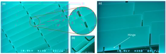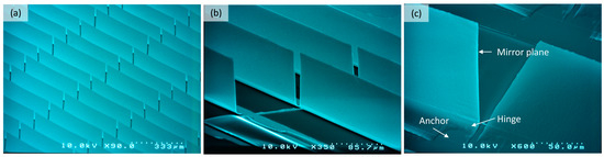 An isolation layer (SiO2) with a thickness of approximately several 100 nm is deposited on FTO structures using a PECVD process. For the fabrication of micromirror arrays on glass substrate with FTO and SiO2, a UV lithography process is executed to define the micromirror structure on the sacrificial photoresist layer. A special bi-layered photomask [40] was used, capable of forming leading edge and undercut in a single exposure step. A metal layer stack of multiple metal thin layers combining Al and Cr is deposited via EBPVD (electron beam physical vapor deposition) with thickness ranging within 60–100 nm and 10–40 nm of Cr, respectively. It is important to note that the thicknesses are given in ranges since they vary by design, desired opening angle, and, as necessary, finetuning to counter processing fluctuations. Subsequently, a lift-off process at 80 °C is executed to remove the sacrificial photoresist layer. Thereafter, the sample is dried using Marangoni drying or IPA vapor drying process to achieve free standing planar micromirror arrays (Figure 9).