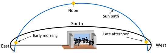 Schematic presentation of a model room equipped with south-oriented MEMS smart window, illustrating sun path and different sun positions throughout the day. Modified figure from [27] with permission of Leuze Publishing House.