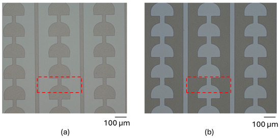 Micrograph of FTO structure after (a) photolithography with photoresist and (b) wet chemical etching, cleaning process and photoresist removal. Corresponding area of FTO structure for a single micromirror is defined by the red dashed lines. Original figure from [27] with permission of Leuze Publishing House.