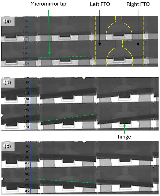 Micrographs of micromirror arrays in (a) free-standing open position, and (b) when micromirrors are actuated towards the right and (c) left while applying voltage between micromirror and FTO pads. The micrographs are taken in reflection mode and the angle is shown with a green dashed line. Modified figure from [27] with permission of Leuze Publishing House.