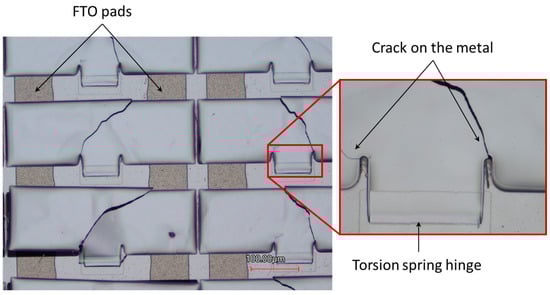 During the movement of micromirrors via electrostatic attraction force, crack formation in metallic micromirrors is observed in many cases at the edge of the narrow gap (<5 µm) between the torsion spring hinge and micromirror plane (Figure 16). This results from the induced stress concentration—a common phenomenon in mechanical structures that leads to the complete damage of the micromirrors. The unwanted deformation leads to a compromise of reliability and overall performance, which limits the potential application of micromirror arrays in smart windows.