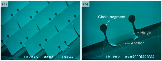 SEM micrograph of micromirror arrays with new design integrating a circle-segment. (a) Planarized free standing micromirror arrays and (b) magnified hinge area, revealing major components of micromirror, fixed anchor, bend hinge and planar micromirror plane.