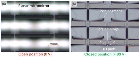 As mentioned in the previous section, the micromirror array module is housed in an inert gas environment after fabrication to eliminate unwanted external effects during electrostatic actuation. The left and right FTO pads, as well as the micromirror arrays, have separate contact areas of the substrate. A multichannel waveform generator is used to apply voltages to the micromirror arrays and FTO pads independently. The movement of micromirror arrays in electrostatic actuation is observed under a microscope. In Figure 18, the micromirror array movement from open to closed states during electrostatic actuation is observed without any damage due to stress-concentrated crack formation. The micromirror arrays return back to their original open state when the actuation voltage is removed.