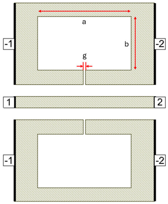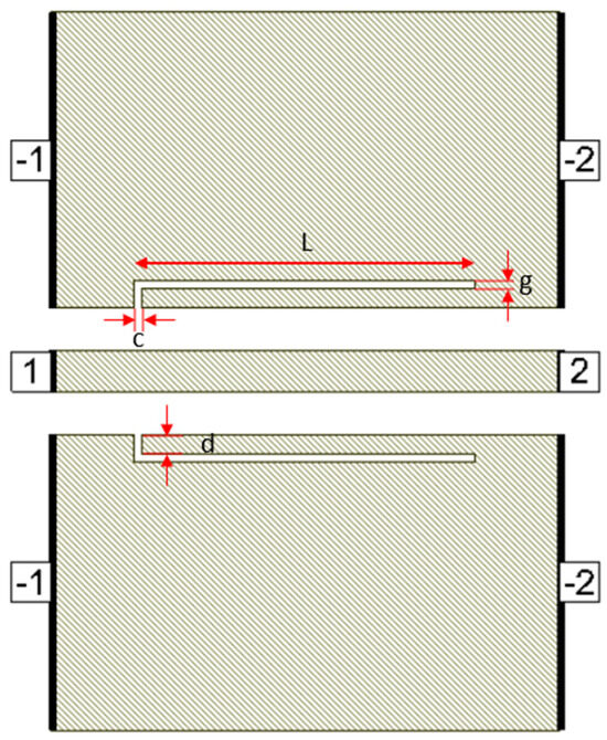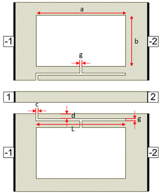 Defects in the ground plane of transmission lines can have different geometrical shapes, resulting in determining transmission line characteristics and yielding different frequency responses. Many researchers have proposed different defect shapes [13,14,16,17,18,19] for sub-6 GHz frequency band and [3] for mmW frequency band. The dumbbell DGS shown in Figure 1, introduced in [13], using microstrip transmission line has narrow and wide etched areas. These defects increase the effective inductance and capacitance of the transmission line. The rectangular patch a × b has dimensions of 400 µm × 230 µm and the gap width g is 10 µm. The u-slot DGS shown in Figure 2, introduced in [16], also uses a microstrip line and is redesigned for CPW line configuration. Slot length L is 402.5 µm, distance d is 22.5 µm and slot width c = g = 10 µm.