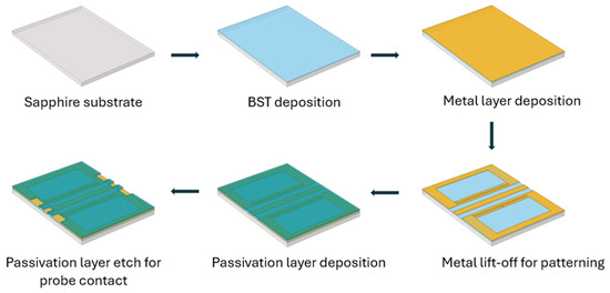The designed DGS devices were fabricated on a C-cut sapphire substrate, as shown in Figure 4. BST thin films are deposited on the wafer using the pulsed laser deposition (PLD) technique. The substrate is heated to 900 °C before deposition and kept at this temperature during deposition. Oxygen gas is then released and is maintained at 75 mTorr partial pressure during deposition. A beam of high-power laser pulses using a KrF excimer laser operating at 248 nm wavelength with a pulse repetition frequency of 30 Hz and laser energy about 175–180 mJ is directed towards a BST target to deposit a 500 nm thin film of BST on the surface of the wafer [20,21]. On top of the BST, a 500 nm thick Ti/Pt/Au (20/100/380 nm) metal composition is deposited. A thin layer of titanium (Ti) is used for adhesion, followed by a platinum (Pt) thin film which acts as the oxygen-permeable layer, and finally gold (Au) to create thicker metal contact. DGSs were created using this metal composition. These metals are deposited using the e-beam evaporation technique. The lift-off process is used to remove metal to create defects in the ground plane. Finally, a 250 nm silicon nitride (Si3N4) thin film is deposited for passivation and etched for probe contacts, as seen in Figure 4.