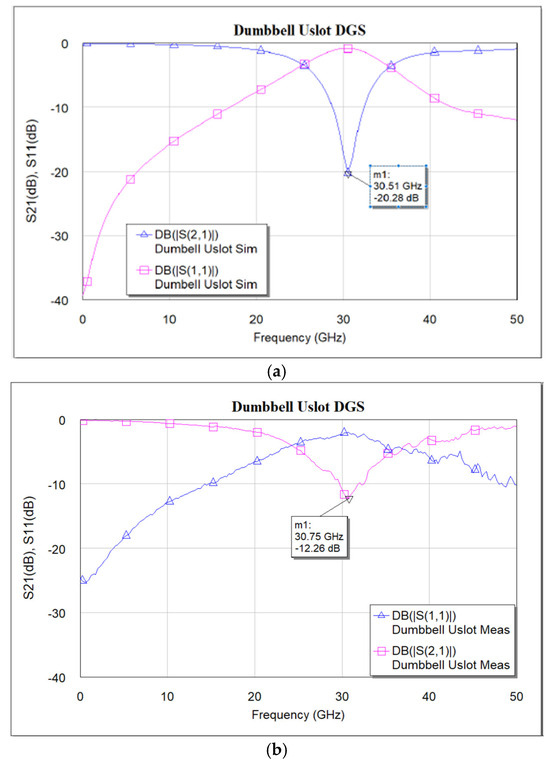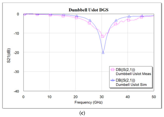 The designed devices have been analyzed using NI AWR design environment 15. BST εr = 700 is used for all simulations. As mentioned earlier, the CPW line is designed to have a characteristic impedance of 50 Ω. Figure 5a–c shows the simulated and measured frequency response of the dumbbell u-slot DGS shown in Figure 3. Figure 6 and Figure 7 show the simulated vs measured frequency response of the dumbbell DGS and u-slot DGS shown in Figure 1 and Figure 2, respectively. G-S-G probes with 150 µm pitch are used to measure the RF performance of the filter. The rectangular patch of the dumbbell DGS increases the series inductance, which in turn increases the reactance of the transmission line with an increase in frequency. This initiates the rejection of certain frequencies. The position of the attenuation pole is determined by the series inductance in parallel with the capacitance. This acts like a parallel LC resonator. As can be seen in Figure 6, the measured results show that the dumbbell DGS resonates around 50 GHz. Whereas from Figure 7, it is evident that the u-slot defect alone does not generate enough capacitance and inductance for the filter to resonate in the frequency of interest. To shift the resonance to a lower frequency, we must increase the inductance and capacitance, i.e., we must increase defect dimensions in each case. However, by combining both defects we can see resonance around 30 GHz for the same defect sizes; this helps in reducing the overall size of the filter. Having a high-dielectric material like BST also helps to reduce the size of the device, as we can get large capacitance and inductance values with small size defects.