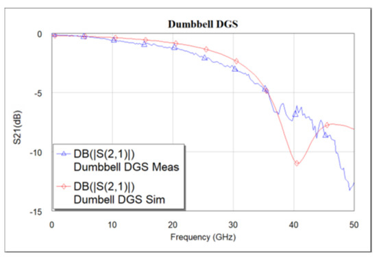 Simulated vs. measured S21 frequency response of dumbbell DGS.