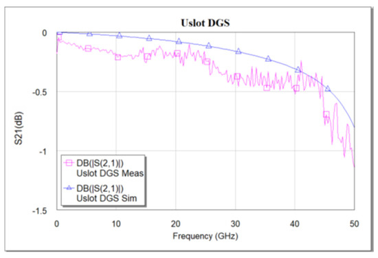 Simulated vs. measured S21 frequency response of u-slot DGS.
