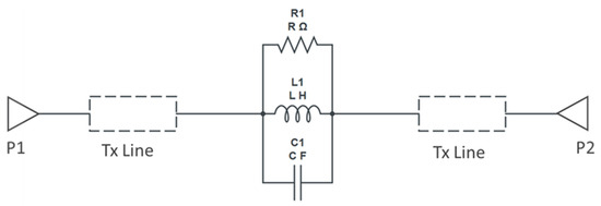 where is the angular resonance frequency, is the 3-dB cutoff angular frequency and is the characteristic impedance of the transmission line. In [12,23], an improved equivalent circuit parameter extraction method for a dumbbell-shape DGS is proposed. However, for the dumbbell u-slot DGS proposed here, the equivalent circuit parameters are extracted using the AWR tool, which provides a variable tuner to fine-tune the parameters. The parameters are tuned to match the measured results. Figure 8 shows the equivalent circuit model used to extract circuit parameters for the dumbbell u-slot DGS. The two transmission line blocks used are for representing the transmission line before and after the defect, while the defect is represented by a parallel RLC circuit with R = 560 Ω, C = 0.136 pF and L = 0.198 nH for the dumbbell u-slot DGS.