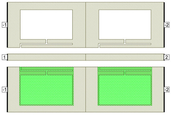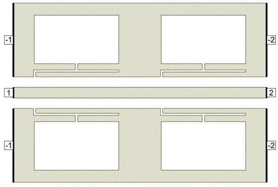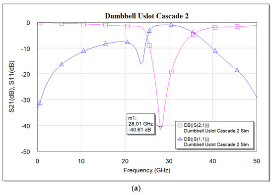 Deeper rejection is achieved by cascading multiple standalone filter units. Here, a cascade of two dumbbell u-slot DGS filters is demonstrated; as we increase the number of cascades, deeper rejection is achieved and cascading occurs along the transmission line direction. Figure 9 shows the filter layout of cascading of two dumbbell u-slot DGSs. The same dimensions as shown in Figure 3 are used. Any change in the dimensions causes changes in the capacitance and inductance values, which in turn yield more than one resonance frequency. Variations in the film thickness can also yield multiple resonances in the frequency response. When the capacitance and inductance of both single units are the same, a single resonance with deeper rejection and narrow bandwidth is observed, as shown in Figure 10a–c, where simulation and measured results are presented. As can clearly be seen in Figure 10, the results indicate that cascading the two-unit cells gives about −39.64 dB rejection compared to about −12.26 dB rejection from a single cell.