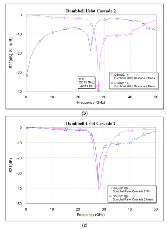 (a) Simulated frequency response of cascaded dumbbell u-slot DGS. (b) Measured frequency response of cascaded dumbbell u-slot DGS. (c) Simulated vs. measured S21 frequency response of cascaded dumbbell u-slot DGS.