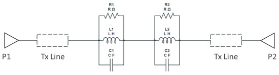The slight shift in the resonance frequency, as well as the narrow bandwidth from the measurements, are due to the combination of de-embedding errors and the CPW signal line’s parasitic coupling to the ground. For longer devices, the de-embedding errors play a vital role. The higher insertion loss after the notch is also mainly due to the above-mentioned reasons along with dielectric losses of the BST thin film. As a notch filter, the circuit behaves inductively, and after resonance it behaves capacitively. The modified varactor device with metal–insulator–metal capacitor (MIMCAP) structure using BST thin film typically has a Q-factor of about 5 with no DC bias voltage applied, and the Q increases to 8 with the application of 10 V DC bias voltage [24]. The equivalent circuit model is the same as shown in Figure 8, but cascaded twice to replicate the two cascaded DGS devices; the equivalent circuit model is shown in Figure 11, and the values extracted from the circuit diagram are R1 = R2 = 8650 Ω, C1 = C2 = 0.233 pF, L1 = L2 = 0.1382 nH. Increased resistor values show deeper rejection at the resonance frequency. The frequency response of the circuit model aligns very well with the measured data; the comparison is shown in Figure 12.
