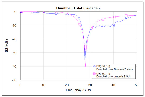Schematic model vs. measured S21 frequency response of cascade dumbbell u-slot DGS.