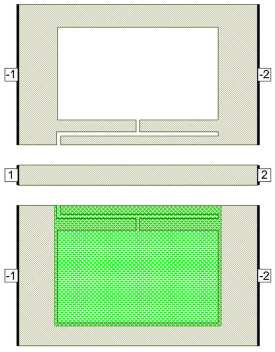 Figure 3 shows a dumbbell u-slot DGS structure using CPW line configuration. In this design, both dumbbell and u-slot DGS are integrated. The u-slot has more capacitance as the thin slot forms a capacitor, being two metal surfaces with a dielectric in between. The dumbbell shape has more inductance with less capacitance, as the rectangular patch makes the current pass through a longer path, thus introducing inductor-like behavior. By integrating both, we can achieve more capacitance and inductance with the same size defects. This improves the filter performance, and a lower resonance frequency is achieved. Defects are symmetrical along the line of signal, i.e., both the ground planes are symmetrical. The CPW line is designed to have a characteristic impedance of 50 Ω.