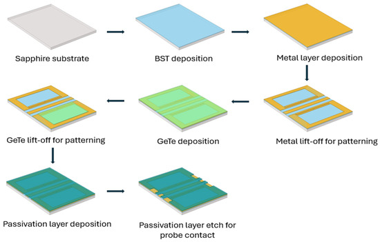 Schematic representation of the fabrication process of a dumbbell u-slot DGS using CPW line configuration with BST and GeTe thin films.