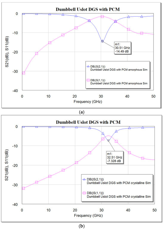 When the PCM is in the amorphous state, the device has inductance and capacitance from the defects in both the ground planes. But when the PCM is in a crystalline state, only inductance and capacitance from defects in one ground plane are seen, as the defects in the other ground plane would be covered with metal. This reduction in the inductance and capacitance will push the resonance to a higher frequency. This can be used for tuning the filter. Further, the tuning range can be adjusted with a PCM layer covering the defect, i.e., partial covering of the defect with PCM would adjust the tuning range accordingly. Figure 15 shows the simulated and measured frequency response of the dumbbell u-slot DGS in both amorphous and crystalline states.