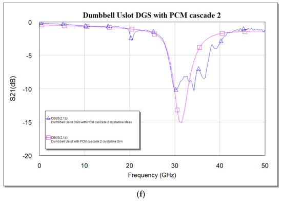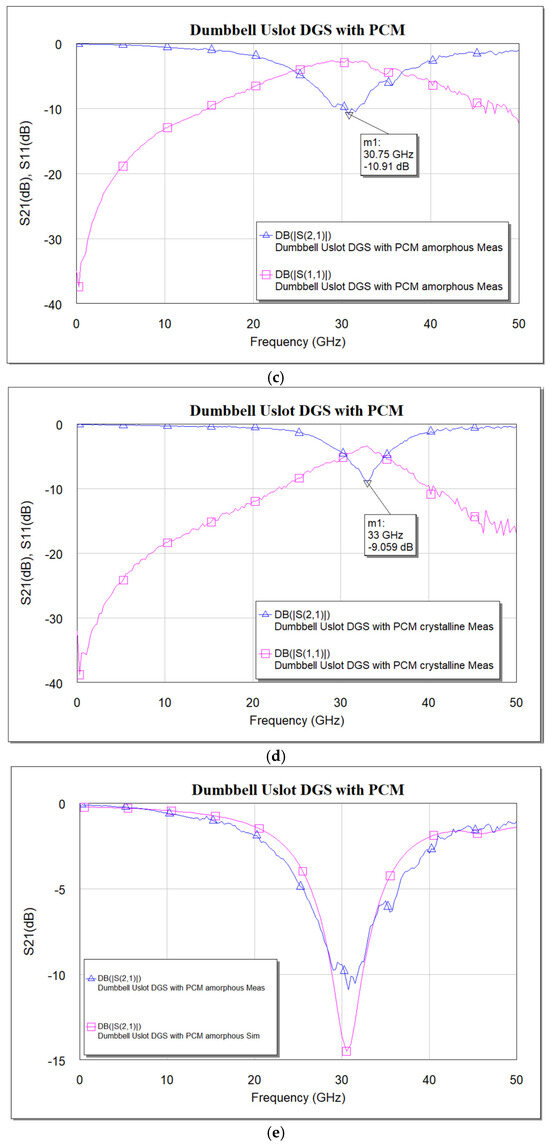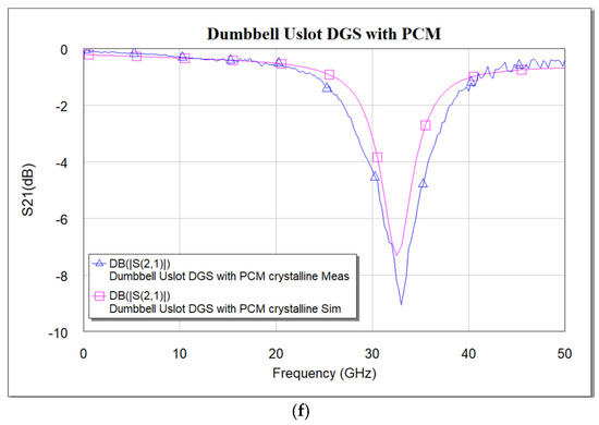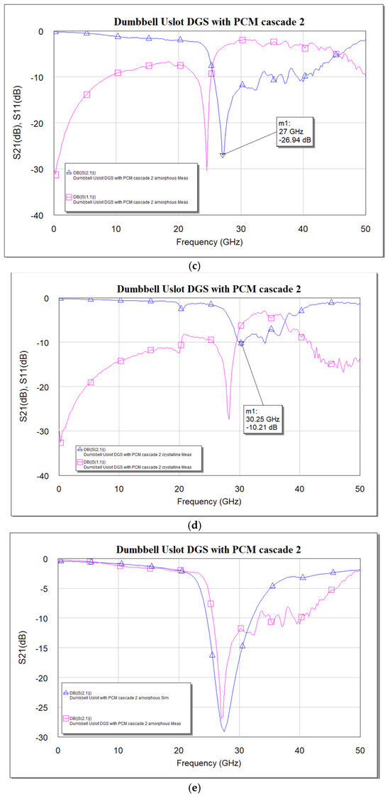 Cascading clearly shows that the effect of using PCM is significant: from the measured data in Figure 17c,d, a shift in resonance frequency from 27 GHz to 30.25 GHz is seen. A frequency shift of about 3.25 GHz is achieved, i.e., 12.04% of tuning is achieved for a cascaded DGS with PCM compared to 2.25 GHz, i.e., 7.32% achieved using a single DGS cell with PCM. The simulation results align well with measurements.