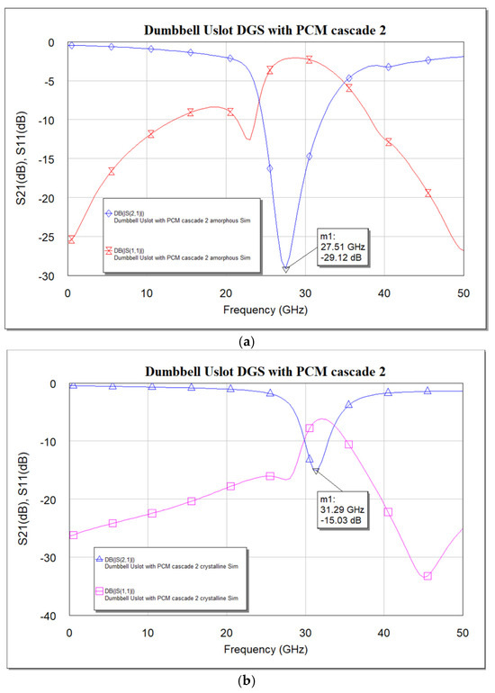 The frequency response in the amorphous state is like that of the dumbbell u-slot DGS: as the PCM is in the amorphous state, the device has inductance and capacitance from the defects in both the ground planes. However, we can see from the frequency response in the crystalline state that the resonance frequency has shifted to a higher frequency, as expected. From Figure 15c,d, it is clear that a shift in resonance frequency from 30.75 GHz to 33 GHz can be seen. A frequency shift of about 2.25 GHz is achieved, i.e., 7.32% of tuning is achieved by using the PCM. The measurements for the amorphous state are taken in the as-deposited state, where the PCM is in a high-resistance state. To make it crystalline, the sample is heated on a hotplate at 240 °C for about 5 min. The germanium telluride thin film transforms from amorphous to crystalline state. The resistivity of the germanium telluride is measured to confirm the crystalline state. GeTe tends to oxidize if heated in open atmospheric conditions; however, the presence of passivation prevents oxidation. Once the sample is cooled down, the measurements are again performed on the same device to see the change in the frequency response. Simulation vs measured results align well. The circuit model shown in Figure 8 is used to extract the parameters for both amorphous and crystalline states. For the amorphous state, R = 430 Ω, C = 0.159 pF, L = 0.171 nH and for the crystalline state, R = 430 Ω, C = 0.315 pF, L = 0.075 nH. The increase in capacitance in the crystalline state makes sense, as a big piece of metal PCM in the crystalline state applies a large parasitic capacitance to the substrate. The significance of the use of PCM can be seen when two-unit cells are cascaded, as shown in Figure 16. The repeatability is still under investigation, as GeTe requires about 725 °C for re-amorphization. This high temperature damages the crystal structure of the BST thin film which is deposited under it. Efforts are underway to find alternative material combinations with which repeatability can be achieved.