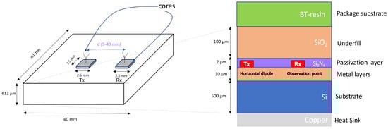 Figure 2 shows the cross-section of an un-flipped chip [,]. The top layer consists of the package substrate, featuring Bismaleimide Triazine (BT)-resin as the dielectric material. A 100 µm thick silicon dioxide, SiO2, underfill layer is used, with a 2 µm thick passivation layer of silicon nitride, Si3N4, containing integrated on-chip antennas. The metal layers total 10 µm in thickness and are filled with SiO2. The silicon substrate is 500 µm thick, with copper beneath it for heat dissipation. Given that the core dimensions are 2.5 mm in length and width, the minimum spacing between adjacent transmitters and receivers is 5 mm. With the total iWise-256 dimensions being 40 mm × 40 mm × 612 µm, the wireless transmission distance ranges from 5 to 40 mm.