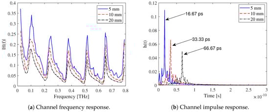 Figure 3 shows the channel response for a CMOS-based WiNoC channel in the THz range for three different path lengths: 5, 10, and 20 mm. As the distance increases, heavy attenuation is observed in both the frequency and impulse response profiles. In Figure 3a, the oscillating and periodic behavior of the frequency response is evident due to the interaction of surface and guided waves []. The WiNoC channel forms a coated dielectric waveguide, supporting both surface and guided waves. The metal layers act as reflective boundaries, while the silicon substrate serves as the guiding medium. The heat sink influences the overall wave propagation environment (cf., Figure 2). Constructive interference at specific frequencies enhances the field intensity, leading to peaks in the frequency response, while destructive interference causes dips. These periodic behaviors correspond to the difference in cutoff frequencies between adjacent surface wave and guided wave modes []. As the transmitter–receiver distance increases, the frequency response gain decreases. In Figure 3b, the THz-WiNoC channel impulse response is shown, with delay observed in addition to attenuation. The impulse response peaks correspond to the delay at the receiver, matching the respective distances from the source. Furthermore, the temporal spread of the impulse response indicates dispersion in the WiNoC channel, resulting in signal spreading over time.