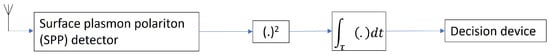 To elucidate the synchronization strategy, a noncoherent WiNoC receiver structure is proposed, as illustrated in Figure 4. Noncoherent receivers are particularly suitable for pulsed THz nanosystems due to their simplicity in implementation [,]. While WiNoC environments benefit from sustained energy supply, they require efficient signal processing algorithms to minimize resource consumption and conserve device battery power. Consequently, a noncoherent energy-detection receiver is proposed for pulse-based THz-WiNoC communications. The proposed receiver operates in the THz band, leveraging graphene-based plasmonics for signal propagation. The architecture begins with an SPP detector, followed by a noncoherent energy detection scheme. Unlike coherent receivers, which require components such as a template signal generator, PLL, and timing control blocks, the key element of the noncoherent receiver is a squaring device that eliminates the phase or polarity information. The subsequent integrator captures the signal energy over a duration , significantly reducing both hardware and computational complexity. The received preamble signal can be expressed as: