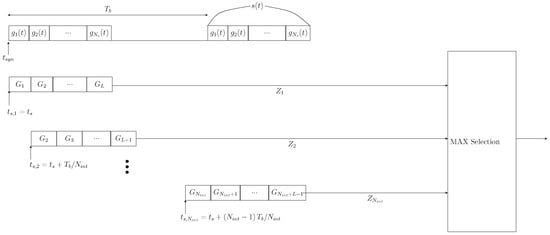 The proposed synchronization process is depicted in Figure 5. It is assumed that integrations are required to collect the entire preamble energy. The observation window of the integrator is divided into sub-windows, each of size . Compared to the traditional single-window method, the sampling rate increases by a factor of L, where L is the total number of sub-windows, given by . The sub-window width may or may not equal the pulse width, . Given , the total number of sub-windows become . In this scenario, the starting point of the th integrator is defined as []