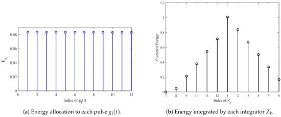 The basic pulse, , is modeled as a long first derivative of a Gaussian pulse. Figure 6a illustrates the energy allocated to each , determined by solving a constrained nonlinear optimization problem. Figure 6b shows the energy collected by the integrators. As designed, the first integrator collects the maximum energy, making its corresponding time the optimal ToA.