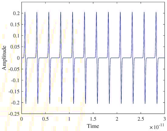 where denotes the normalization constant, represents the standard deviation of the pulse, which controls the width, and indicates the time delay. The power spectral density of these pulses predominantly features frequency components in the THz band [].