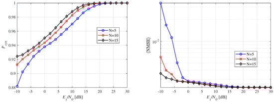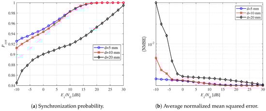 To evaluate the performance of the proposed scheme, we utilize the synchronization probability, , and the average normalized mean squared error, . The quantifies the synchronization accuracy by measuring the mean squared error between the estimated ToA and the ideal ToA. Mathematically, it is defined as []