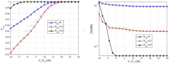 Figure 10a presents synchronization performance for varying numbers of preamble repetitions, N. As N increases, synchronization probability improves, particularly in low-SNR regions. For example, with , a synchronization probability of over 0.9 is achieved in low-SNR regions, and over 0.98 in high-SNR regions (10 dB or more). For high-reliability THz-WiNoC communications, perfect synchronization is essential, and the results are promising in this context. The observed synchronization trend can be attributed to the fact that repeating the preamble signal multiple times increases the amount of signal energy captured by the sub-windows, even in low signal power conditions. Thus, increasing the value of N enables the receiver to better combat noise and achieve improved synchronization. Figure 10b shows the average NMSE, which, like , depends on N. Overall, a higher number of preamble repetitions leads to more reliable synchronization due to enhanced detection accuracy and noise averaging. However, it may result in a synchronization delay.