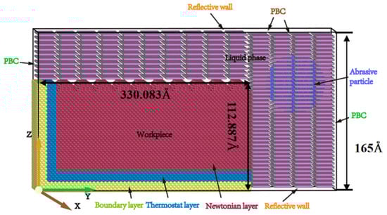 Figure 13a, it is evident that with the increase in the abrasive particle sizes, the temperature of the workpiece’s Newtonian layer presents an increasing trend. Under the same displacement distance of the cutting particles, because the larger abrasive particle sizes will act on more workpiece atoms, more cutting heat will be generated. This will enhance the nucleation and activity of dislocations in the workpiece thereby increasing the possibility of internal defect structures appearing. Conversely, a smaller particle size will generate less heat, which will make the temperature of the workpiece more stable. It can be seen from