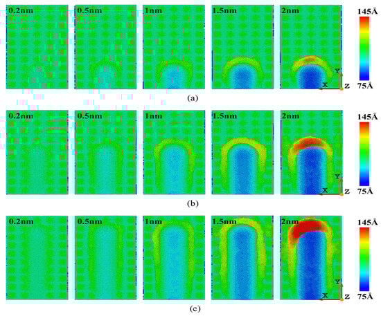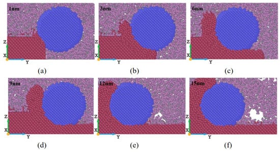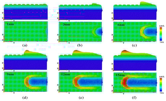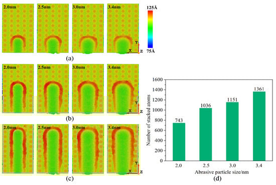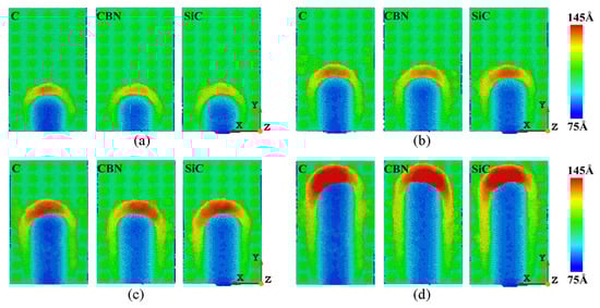 Figure 5 shows that the atoms of the workpiece are squeezed, causing them to accumulate at the front of the abrasive atoms and on both sides of the groove. With the size of the abrasive particles increasing, more workpiece atoms accumulate at the front of the abrasive particles. This is because the larger the abrasive particles, the more workpiece atoms come into contact with the abrasive particles thereby increasing the cutting range of the abrasive particles and enhancing the cutting effect. In the X direction, more workpiece atoms will shift, causing the chip atoms formed by cutting to gather more evenly in front of the abrasive particles. Therefore, a larger abrasive particle size will increase the number of chip atoms. In addition, in the actual processing and production process, the larger the size of abrasive particles, the greater the initial cutting depth. Therefore, with the continuous increase in displacement distance of cutting particles, the influence of abrasive particle size is more significant compared to other processing parameters in the cutting process. However, during the machining process, it is not necessarily better to have larger abrasive particle sizes, as material properties need to be considered. At room temperature, γ-TiAl alloy is a brittle material, and when selecting particle size, it is necessary to consider that the cutting depth should not exceed the critical value of the material’s ductile–brittle transition depth. Therefore, we should choose the abrasive particle sizes reasonably based on increasing the material removal rate as much as possible.