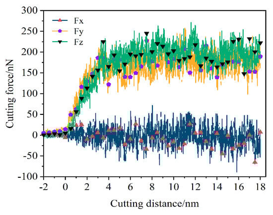 Figure 7. The main cutting force shows a slow increase trend, but the increase trend is not obvious. The main cutting force Fy and the normal cutting force rise rapidly because the abrasive particles begin to act on the workpiece when the abrasive particles start to cut the workpiece. The lateral force Fx is mainly manifested as the frictional force between atoms. It fluctuates around Fx = 0 N during the whole process. According to the changing trend of cutting force, the machining process can be divided into an initial machining phase and a stable machining phase. In the initial processing stage, the main cutting force Fy and the normal force Fz have similar changing trends, both showing a rapid increase trend followed by a fluctuating upward and downward trend. From the trend of cutting force changes in the figure, it can be seen that cutting forces Fy and Fz play a decisive role in the final machining effect. The cutting forces Fy and Fz no longer continue to increase but start to fluctuate continuously around a certain value when the displacement distance of cutting particles reaches 3 nm. This shows that the processing stage has entered the stable processing stage from the initial processing stage.