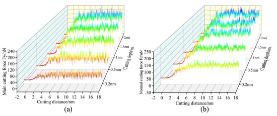 Figure 8. It can be seen that as the cutting depth increases from 0.2 nm to 2 nm, the cutting forces Fy and Fz show an increasing trend. This is because the contact area between the abrasive particles and the workpiece increases with the increase in cutting depth, and more workpiece atoms are sheared and squeezed by the abrasive particles, resulting in more atom displacement and accumulation, which requires abrasive particles to have greater cutting force. As the cutting depth increases, the displacement distance of the cutting particles at which the cutting force reaches a stable fluctuation also increases, which means that the workpiece requires a longer displacement distance of cutting particles to enter the stable cutting stage. In addition, the fluctuation range of different cutting depths is not the same, and the fluctuation range is wider with the increase in cutting depth. As mentioned earlier, the nucleation, expansion, and annihilation of the internal defect structure of the workpiece lead to the reciprocating fluctuation of the cutting force. Therefore, this progress can be explained as follows: the greater the cutting depth, the greater the cutting force acting on the workpiece atoms, and the greater the number of material atoms resulting in lattice deformation and lattice reconstruction, resulting in a phenomenon of different fluctuation amplitude of the cutting force.