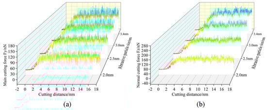 Figure 9. As the abrasive particle sizes increase from 2 nm to 3.4 nm, the cutting forces Fy and Fz show an increasing trend, and this trend becomes more obvious with the increase in the abrasive particle sizes. This can be explained as a larger abrasive particle size will increase the processing range, and more workpiece atoms will participate in the process; the abrasive particles will act on more of the workpiece atoms, and these workpiece atoms are displaced when subjected to squeeze and shear, moving in front of and above the abrasive particles to form chips, or moving under the abrasive particles to form the processed surface, which will require abrasive particles to provide greater cutting force.