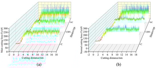 Figure 10. It is evident that the overall trends of the main cutting forces and normal cutting forces are relatively similar when machining the γ-TiAl alloy workpiece with three types of abrasives. However, when selecting the SiC grinding grain for processing workpieces, the phenomenon of fluctuating cutting force throughout the entire process is very apparent, with a relatively large range of fluctuations. As mentioned earlier, this fluctuation phenomenon is mainly related to the generation of lattice phase transformation, lattice reconstruction, the generation of amorphous structure, and the evolution of microstructure defects in the workpiece. This kind of fluctuation is the least obvious when choosing CBN abrasive particles to process the workpiece. It is somewhere along the lines of selecting diamond abrasive particles to process workpieces. Therefore, it can be considered that when selecting the SiC abrasive particle to process the γ-TiAl alloy workpiece, the lattice structure changes and defect structure activities inside the workpiece are more frequent, while the internal defect activity is less when choosing CBN abrasive particle processing.