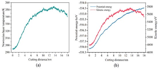 Figure 11a, it is evident that when the displacement distance of the cutting particles is small, since the abrasive particles just start to contact the workpiece, only the squeezing effect is produced on the workpiece, the generated chips and lattice transformation are relatively small, and the cutting heat generated is less, so the temperature of the workpiece increases slowly. The temperature of the Newtonian layer of the workpiece increases with the increase in displacement distance of the cutting particles. On the one hand, the generation of a large amount of cutting heat is attributed to the workpiece atoms being squeezed by the abrasive particles, the chemical bonds between the workpiece atoms being destroyed, the workpiece atoms being displaced, and the kinetic energy of the atoms increasing. On the other hand, as the lattice strain energy stored in the crystal lattice is released, a portion of this energy is transformed into heat. When the displacement distance of cutting particles reaches 6 nm, the temperature of the workpiece Newtonian layer continues to show an increasing trend, but the increasing trend begins to slow down. This is due to the restructuring of the crystal lattice in the workpiece, and the combination of amorphous atoms consumes part of the energy. When the displacement distance of cutting particles exceeds 16 nm, there is a decreasing trend in the temperature of the workpiece’s Newtonian layer. On the one hand, this phenomenon is attributed to the consumption of lattice reconstruction and the combination of amorphous atoms. On the other hand, it is also due to the gradual approach of abrasive particles towards the thermostat layer, resulting in the quick transfer of cutting heat generated by the Newtonian layer to the thermostat layer thereby accelerating the heat balance of the workpiece. The entire process is accompanied by small temperature fluctuations, which are caused by the formation and evolution of the internal dislocation and defect structure of the workpiece. Generally, the increase in workpiece temperature will promote the evolution of internal defects, although the squeezing and shearing of abrasive particles still remain predominant.