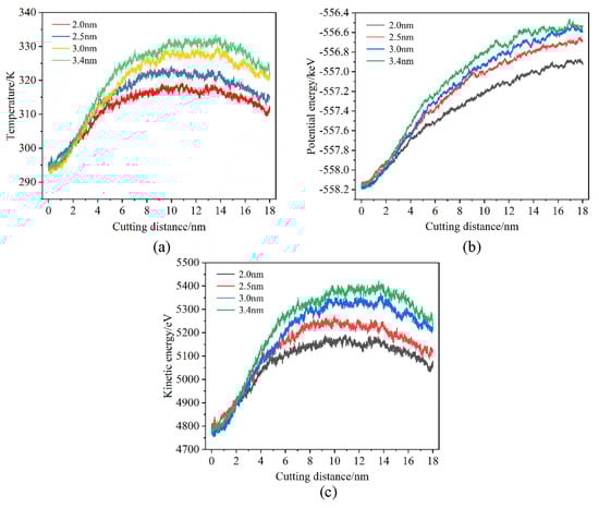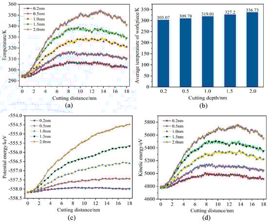 Figure 12c,d, it is seen that as the cutting depth increases, the potential energy and kinetic energy of the workpiece show a gradually increasing trend. This is because as the depth of cutting increases, the contact area between the abrasive particles and the workpiece atoms increases, resulting in more atoms of the workpiece being subjected to the squeezing and shearing of the abrasive particles hence the energy generated by cutting increases, and then the potential energy and kinetic energy gradually increase. Combined with the analysis of the temperature change in the workpiece, it can be considered that a smaller cutting depth can reduce energy consumption through a relatively lower temperature.