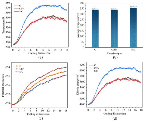 Figure 14c, it is seen that with the increase in the displacement distance of the cutting particles, the potential energy of the three abrasive materials shows a gradually increasing trend during processing. However, the range of potential energy changes when using different abrasive materials is different. When using SiC abrasive particles, the potential energy changes greatly, and the increase is most obvious. The potential energy change is relatively small when using CBN abrasive particles. Diamond abrasive particles are somewhere in between. The continuous increase in potential energy is attributed to the release of stored strain energy from the destroyed lattice structure. So, this can be explained as the squeezing and shearing effects of SiC abrasive particles on the workpiece, leading to the destruction of the lattice structure and the generation of higher energy, resulting in greater potential energy conversion. As mentioned earlier, the trend of kinetic energy changes is basically the same as temperature changes. From